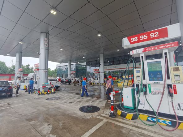 杭州杭石文一村加油站有限公司文二西路加油站(以下簡稱“文二西路加油站”)成立于2018年12月25日,負(fù)責(zé)人徐偉勝,主要從事汽油、柴油的儲存經(jīng)營,不銷售散裝汽油,無自助加油。加油站位于浙江省杭州市余杭區(qū)閑林街道何母橋村,占地面積2751.9m2。屬于中國石化銷售股份有限公司浙江杭州余杭石油分公司下屬加油站。 文二西路加油站持有杭州市應(yīng)急管理局核發(fā)的危險化學(xué)品經(jīng)營許可證,登記編號:浙杭安經(jīng)字[2021]00001503,許可經(jīng)營范圍:帶儲存經(jīng)營 成品油:汽油;有效期至2024年12月26日。已取得浙江省商務(wù)廳核發(fā)的成品油零售經(jīng)營批準(zhǔn)證書,登記編號:油零售證書第31110170號,有效期至2024年1月15日。 加油區(qū)設(shè)置加油罩棚,罩棚下設(shè)置5臺三油品六槍潛油式加油機(汽油)和1臺三油品六槍加油機(此加油機總平面布置圖中編號M106,目前只有柴油,原有92#、95#汽油已不再加注);埋地罐區(qū)設(shè)有4只單層鋼制埋地油罐,其中30m3汽油罐1只(98#)、50m3汽油罐2只(92#、95#)、30m3柴油罐1只(0#),折算后油罐總?cè)莘e145m3(柴油罐折半計入),該站屬于二級加油站。加油站已安裝汽油卸油和加油油氣回收系統(tǒng)。